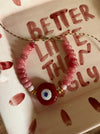 Add a touch of protection and style to your look with this elegant bracelet. Designed with delicate pink natural stone beads, it is highlighted by a striking red eye charm, symbolizing positivity and warding off negative energy.