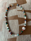 This colourful necklace combines the natural beauty of multicolour stone beads with the timeless elegance of a freshwater pearl bead. Each stone is unique in shade and pattern, creating a vibrant and one-of-a-kind accessory. The freshwater pearl adds a touch of refinement, making this necklace both playful and sophisticated.